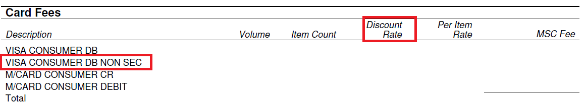 | How are fee costs determined? | In general, card schemes split transactions by regions (e.g. within the EEA or inter-regional – US issued card in EEA business), card types (e.g. Visa debit, MasterCard commercial) and transaction types (Chip and Pin, Ecommerce etc.). Elavon in turn process these transactions as secure or non-secure, any transactions processed as non-secure will incur the higher processing fee. All transactions must also be sent for processing within the prescribed timelines (3 days) to ensure secure qualification is considered*. *a transaction not submitted for processing/not batched via end of day process within prescribed timelines will automatically qualify at the non-secure rate, irrespectively. How transactions are processed and charged are clearly outlined on the Merchant Billing Statement, in the Card Fees section, each transaction type can be identified under the description, see below, Visa Consumer Debit Non Secure transaction –and the Merchant Service Charge (MSC) will appear under the Discount Rate section. |
