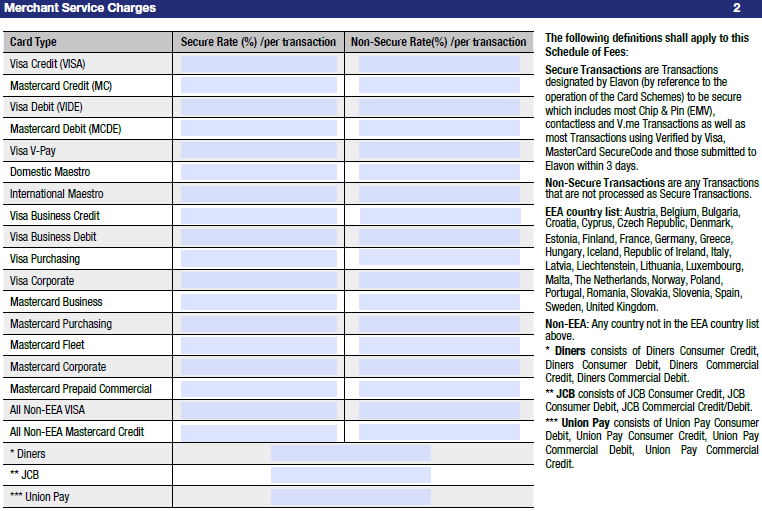 | What is Changing? | In 2016 Elavon introduced new definitions for different types of transaction processing – “secure” and “non-secure”. The Merchant Service Charge (MSC) is higher for non-secure transactions. The Schedule of Fees from 2016 stated that secure transactions are: “Chip & Pin (EMV), contactless, V.me transactions, Verified by Visa, MasterCard SecureCode, and transactions submitted to Elavon within 3 days.” This definition of secure has now been updated as below and applies from 1 January 2019; Secure Transactions are transactions designated by Elavon (by reference to the operation of the Card Schemes) to be secure, which includes most Chip & Pin (EMV), contactless and V.me transactions, as well as most transactions using Verified By Visa, MasterCard SecureCode, and those submitted to Elavon within 3 days. Non-Secure Transactions are any transactions that are not processed as Secure Transactions. |